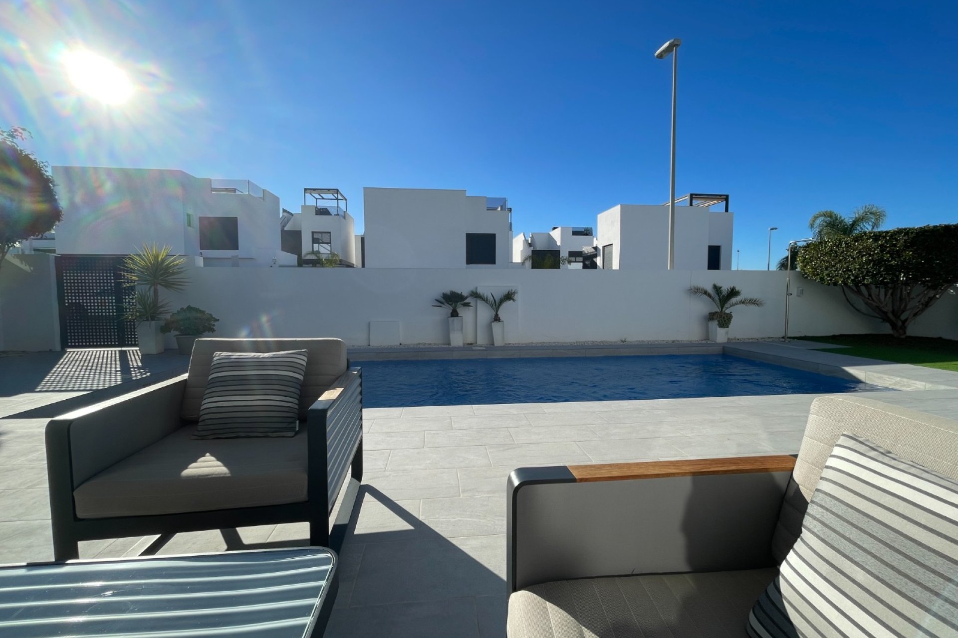 Magnifiziertes freistehendes Haus im Herzen von Benijófar, gebaut im Jahr 2019 und in einwandfreiem Zustand. Diese Immobilie vereint modernes Design, Komfort und eine privilegierte Lage – ideal für alle, die Lebensqualität mit allen Annehmlichkeiten in der Nähe suchen.Das Haus verfügt derzeit über 2 Schlafzimmer, beide geräumig und hell, mit der Möglichkeit, bei Bedarf ein drittes Schlafzimmer einzurichten. Es bietet Fußbodenheizung, Solarmodule und Energieeffizienzklasse B, die Energieeffizienz und maximalen Komfort das ganze Jahr über gewährleisten.Im Außenbereich befindet sich ein größer als üblich dimensionierter Pool von ca. 9 m x 3,5 m, ideal, um das mediterrane Klima zu genießen. Die Immobilie ist in perfektem Zustand, bezugsfertig ohne Renovierungsbedarf.Die Lage ist unschlagbar: in einer ruhigen Gegend, aber dennoch nahe Geschäften, Supermärkten, Dienstleistungen, Restaurants und dem Zentrum von Benijófar, was die perfekte Kombination aus Bequemlichkeit und Privatsphäre bietet.Eine außergewöhnliche, moderne und funktionale Immobilie, ideal als Hauptwohnsitz oder Ferienhaus.