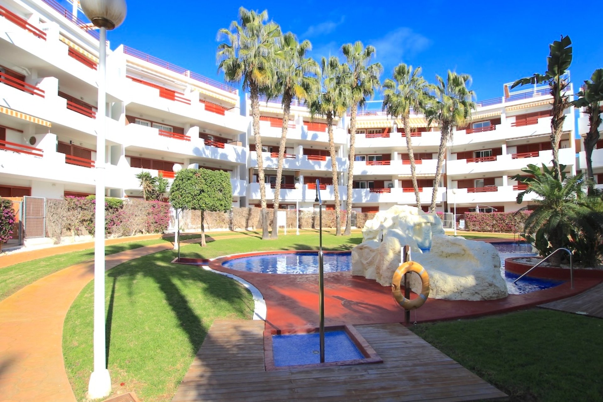Situated in the highly desirable residential area of Playa Flamenca, this beautiful first-floor apartment offers luxury living in a highly sought-after location. Within walking distance to the beach and just a short drive from Zenia Boulevard and several top golf courses, it provides an exceptional coastal lifestyle. Located in the exclusive gated development of El Rincon, residents enjoy access to two communal swimming pools, landscaped gardens, lift access, and a designated off-street parking space. Inside, the apartment features bright and spacious living areas, including an open-plan lounge and dining room that flows into a well-equipped kitchen with ample storage and workspace. There are two generous double bedrooms, each with its own private en-suite bathroom complete with underfloor heating and built-in wardrobes. Both the lounge and main bedroom open onto a large sun terrace overlooking the pool and gardens—an ideal spot to relax and enjoy the Mediterranean climate. Key Features: • Prime location close to the beach, Zenia Boulevard, and golf courses • Gated community with pools, gardens, and lift access • Two double bedrooms with en-suite bathrooms and underfloor heating • Spacious terrace with pool and garden views • Ducted air conditioning and high-quality finishes • Separate storage room • Offered mostly furnished (subject to offer) • Monthly community fee: approx. €66 Within walking distance are a wide range of amenities including shops, restaurants, bars, a sports centre, bus stops, and the popular Saturday street market. The beautiful beaches of Playa Flamenca are just moments away. This fabulous 2-bedroom apartment offers an ideal holiday home or investment opportunity in one of the Costa Blanca’s most sought-after locations. Playa Flamenca is a highly sought-after seaside resort located along the Orihuela Costa, known for its stunning beaches and vibrant atmosphere. The area boasts a wide range of amenities, including shops, pubs, and dining options, making it a popular choice for both tourists and residents. In addition, the nearby Zenia Boulevard provides a large shopping centre for all your retail needs. For those who enjoy golfing, Playa Flamenca is surrounded by top-notch courses like Las Ramblas, Villamartin, Campoamor, and La Colinas, making it a dream destination for golf enthusiasts. The convenience of the location is another major draw, with both the Alicante and Murcia Covera airports just a short drive away, approximately 40 to 45 minutes. Every Saturday, visitors can enjoy the vibrant local market offering fresh produce and local goods, adding to the charm of Playa Flamenca. Whether you are searching for a holiday destination or a permanent residence, Playa Flamenca ticks all the boxes for an ideal lifestyle by the sea. Disclaimer: The information provided within the sales particulars, while regarded as correct, serves as a general reference and does not create any offer or contractual obligations. Prospective buyers should not rely on the particulars as statements of representation of fact and should verify through personal inspections and legal checks. Any furniture, electrical appliances, white goods, or air conditioning units that accompany the sale are offered as pre-owned items without warranties. Images included are for informational purposes only, and it should not be assumed that any depicted items are part of the sale with the property.
