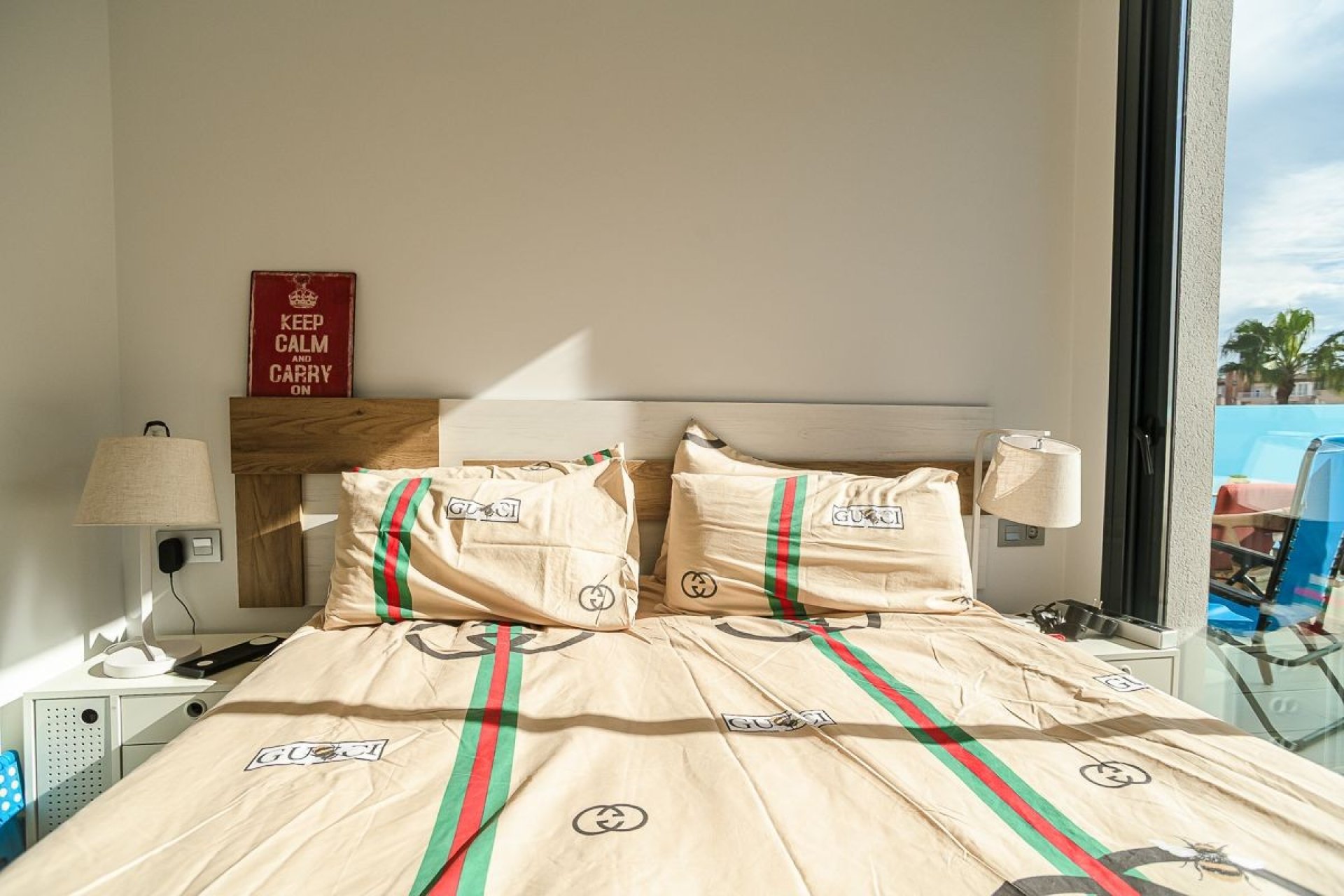 De slaapkamer is voorzien van een ingebouwde kledingkast en een bed met praktische opbergruimte eronder. De lichte woonkamer heeft een comfortabele slaapbank, ideaal voor gasten of extra slaapgelegenheid. De volledig uitgeruste open keuken sluit naadloos aan op de woonkamer, waardoor een ruime en functionele indeling ontstaat. Grenzend aan de keuken bevindt zich een aparte bijkeuken met de boiler en extra opbergruimte.